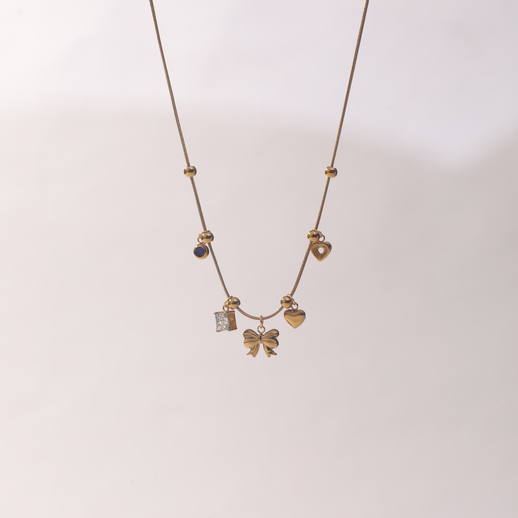 The Golden Keepsake Bow Necklace is a playful blend of elegance and meaning. Designed with a delicate gold-tone chain and a mix of charming accents—hearts, a bow, and sparkling stone details—this necklace feels personal, expressive, and effortlessly stylish. Each charm adds its own story, making the piece feel unique every time you wear it. Light, versatile, and full of character, it’s perfect for layering or wearing solo as a statement of your mood, memories, and style.