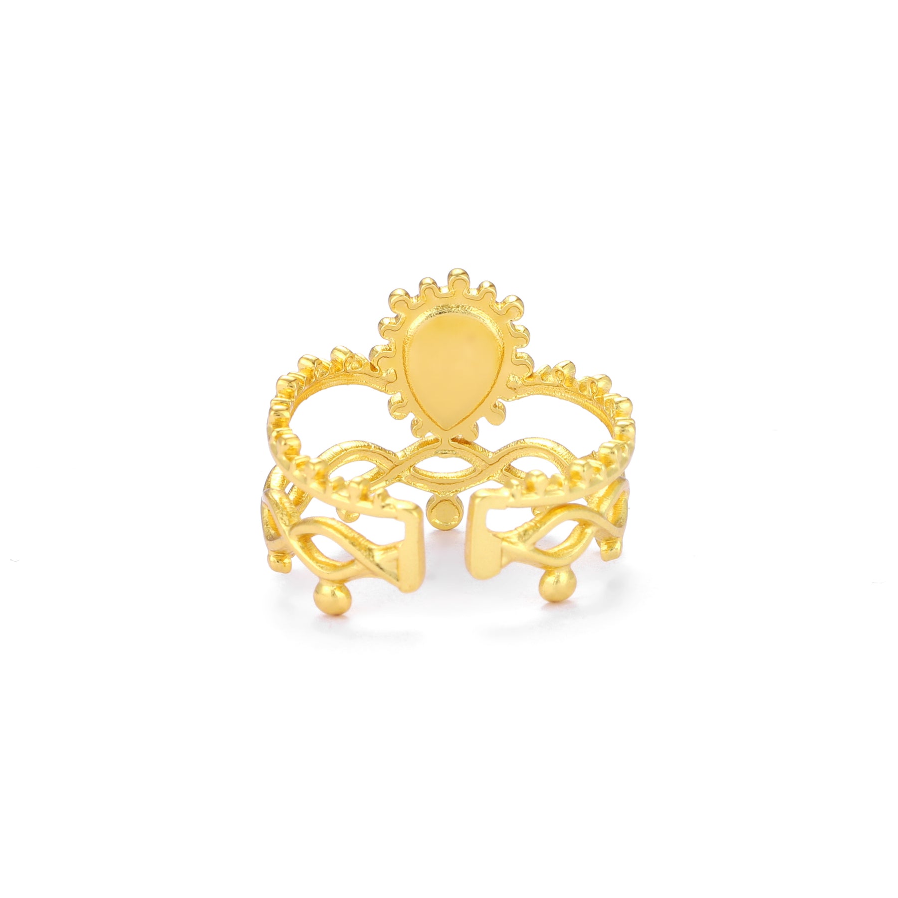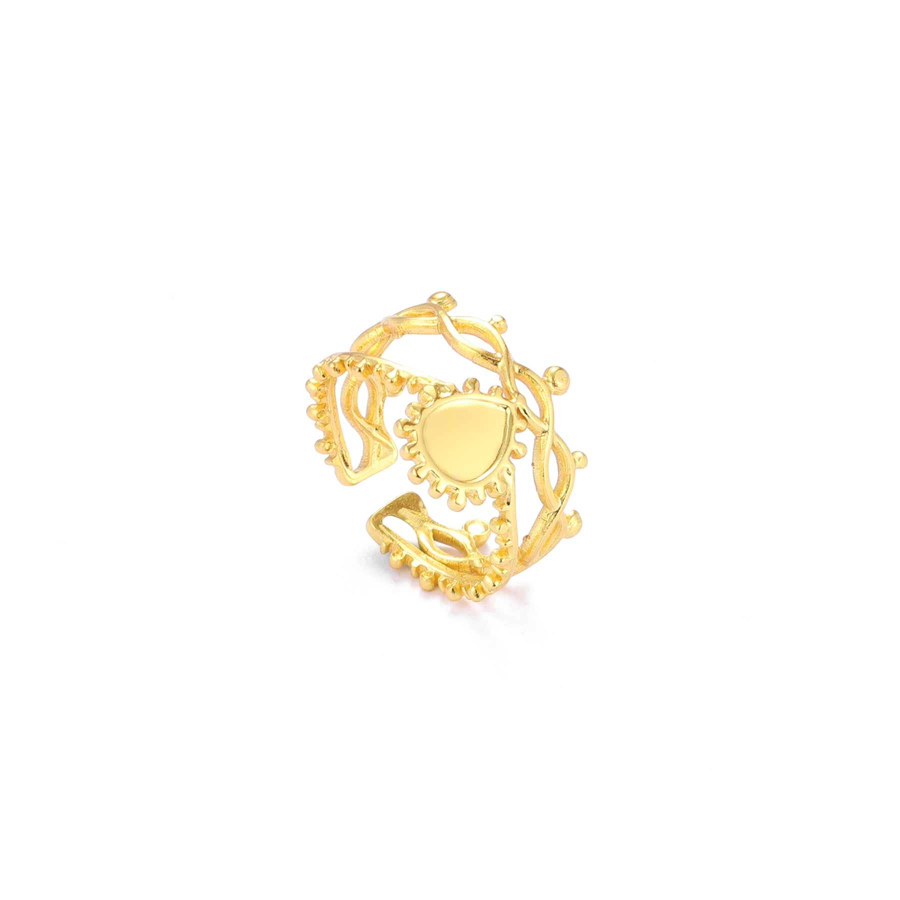 The Sunvine Heritage Ring is a celebration of tradition blended with artistic elegance. Crafted with intricate vine-like detailing and delicate bead accents, this ring wraps gracefully around the finger, creating a rich and regal look. The smooth central motif reflects light beautifully, adding warmth and depth to the design. Inspired by heritage jewelry with a modern touch, this piece feels timeless, expressive, and full of character. Perfect for those who love statement accessories with cultural charm, it elevates both festive and everyday outfits effortlessly.