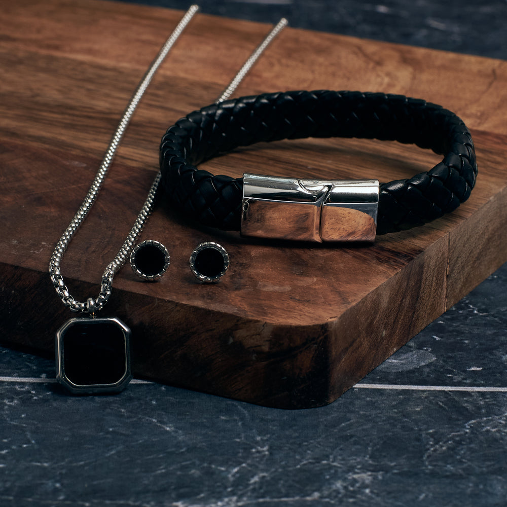 Step into sleek sophistication with the Midnight Alpha Combo Set. This bold trio includes a woven black leather bracelet with a magnetic silver clasp, a geometric black pendant necklace, and matching jet-black studs. Designed for those who command attention without saying a word, this set blends rugged texture with refined detail—making it the perfect everyday upgrade or a gift with edge.Changed your mind? No stress. 🧘♀️
