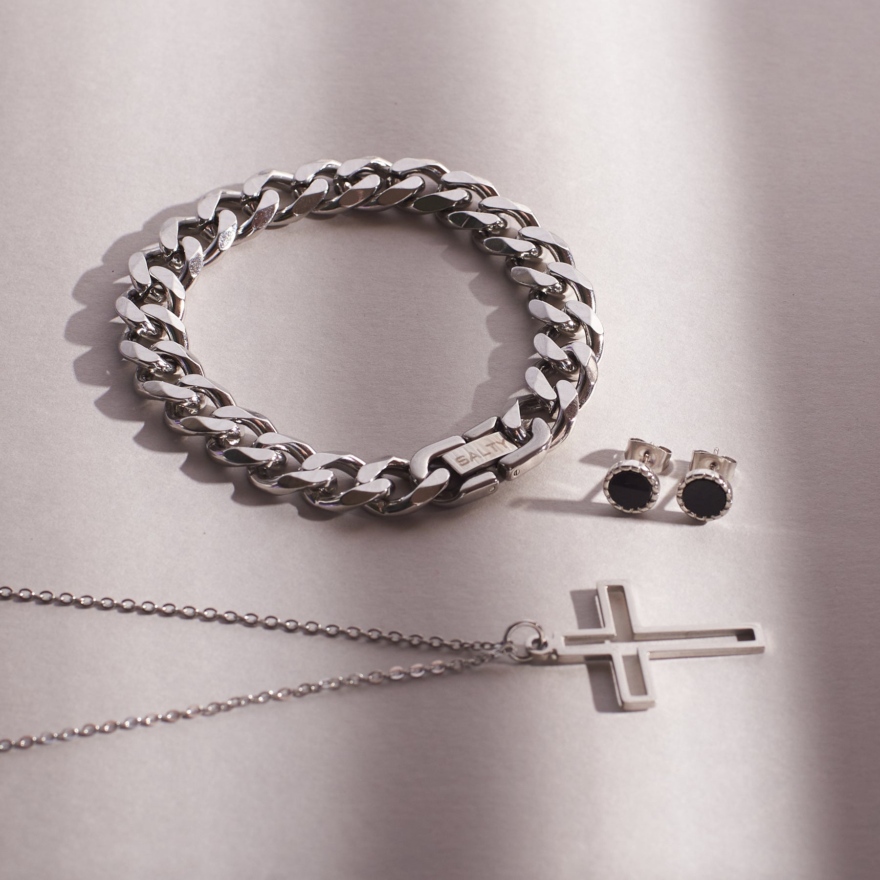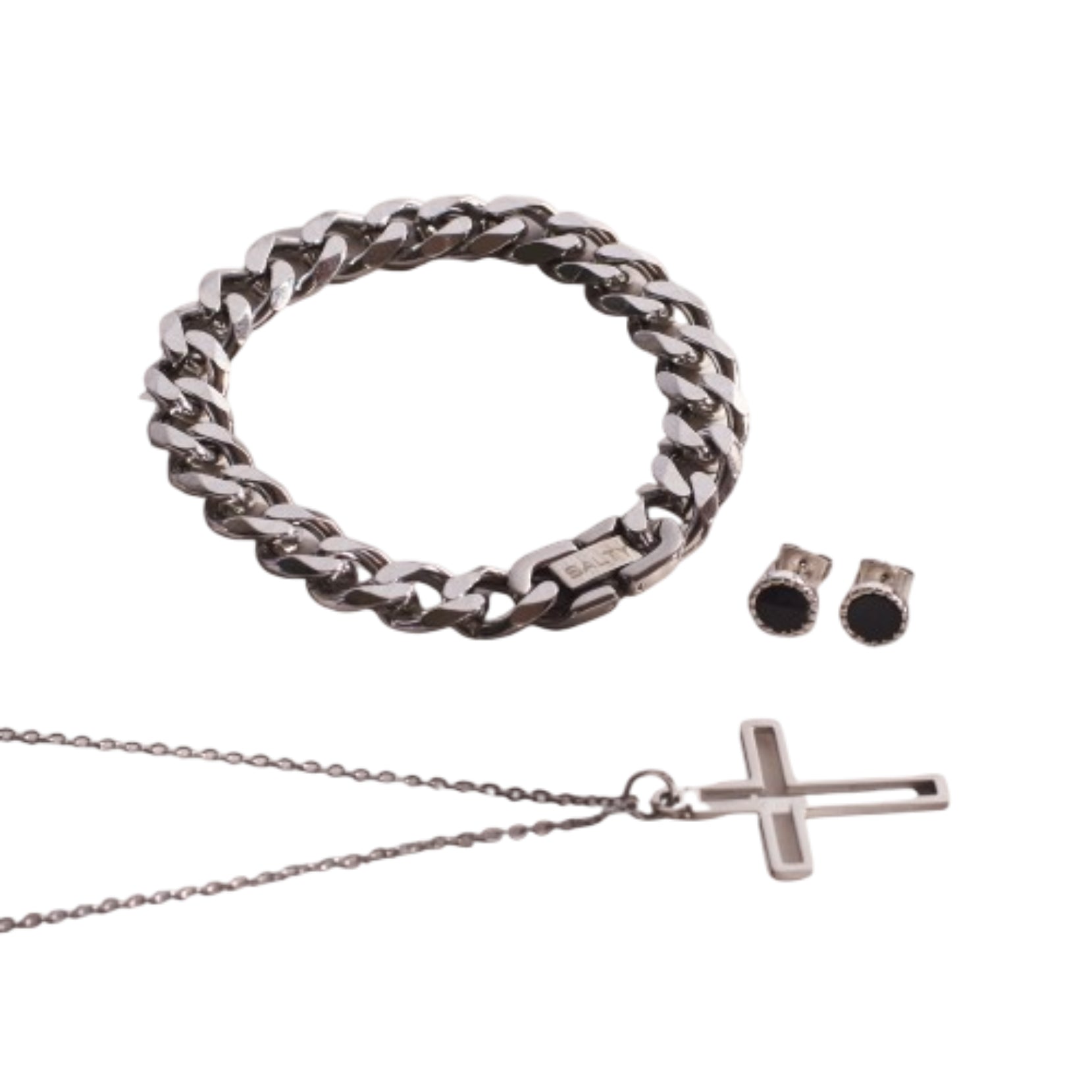 Channel strength and devotion with the Titan Faith Combo, a powerful trio that blends rugged style with spiritual depth. Featuring the Jesus Love Silver Chain, a symbol of faith and timeless elegance, the Hades Classic Silver Thick Bracelet for a bold, masculine edge, and the Black Beaten Studs to complete the look with subtle rebellion—this set is perfect for men who carry their strength with purpose. Whether for daily wear or special occasions, it’s a statement of both style and belief.Highlights:Includes Jesus Love Silver Chain, Hades Classic Silver Thick Bracelet, & Black Beaten StudsFaith-inspired silver chain symbolizing devotionRugged thick bracelet for timeless masculine style