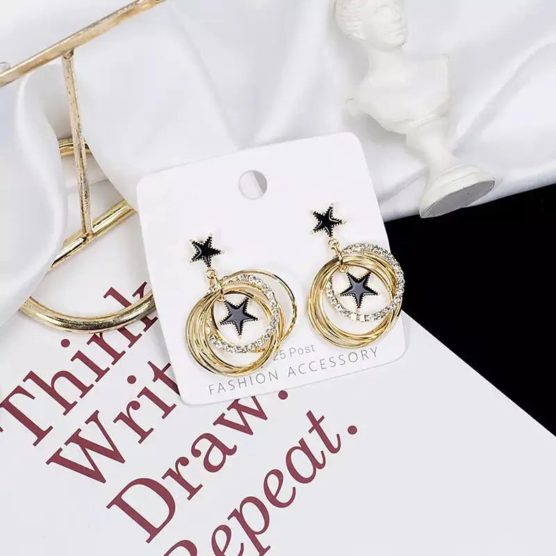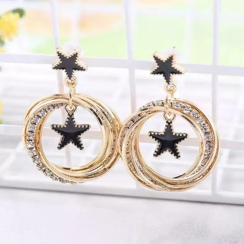 Double Star Black Enamel Circle Earrings